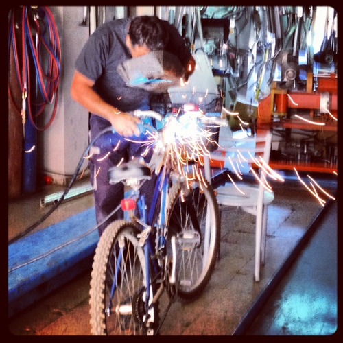 I looked to the left and right of the road to see if, by any chance, there were any bicycle shops around. There wasn’t. There was however, a car garage. This was my best bet. I ride into the garage puffed out looking a little worse for wear. I ask for help. I was warmly welcomed by the owner who took one look at my bike and immediately realised that the weight of the basket was pushing down on the reflector which in turn was pushing down on the brake wire. I had been cycling with the brakes tightly enclosed around the front tire. “Ahhh, that explains it” I say, feeling like a bit of a dumb-ass at this point. The garage owner goes to get a screwdriver and tightens the basket and the reflector. I was ready to set off on my not so merry way, when he suggests welding a piece of metal from the basket to the frame of the bike to act as support. I agreed that would be a good idea and he got to work. He got out his metal welder and face protector. Lots of flying sparks and 10 minutes later I had a fully secured basket. But he didn’t end there. He continued to spray paint the area to make it look pretty and then oiled the chain, breaks and pedals, perfecting his work. He did all this with such care and precision and charged me absolutely nothing. That, friends, is a random act of kindness. It’s not even his job to fix bicycles and yet took it upon himself to help me out.