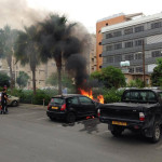 The car on fire.