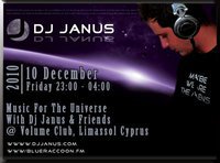 MUSIC FOR THE UNIVERSE @ CLUB VOLUME Friday 10th DECEMBER 2010 ON FRIDAY 10TH DEC AT CLUB VOLUME WE HAVE A VERY SPECIAL NIGHT MUSIC FOR THE UNIVERSE FT DJ JANUS A TRANCE JOURNEY LIKE NO OTHER www.djjanus.com www.blueraccoon.fm DOORS OPEN 11PM TILL LATE ENTRY 10 EURO INCLUDES FREE DRINK Event created by Club Volume-Limassol,Cyprus […]